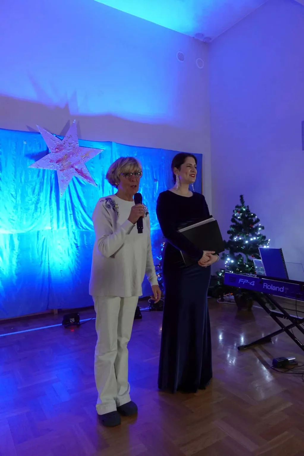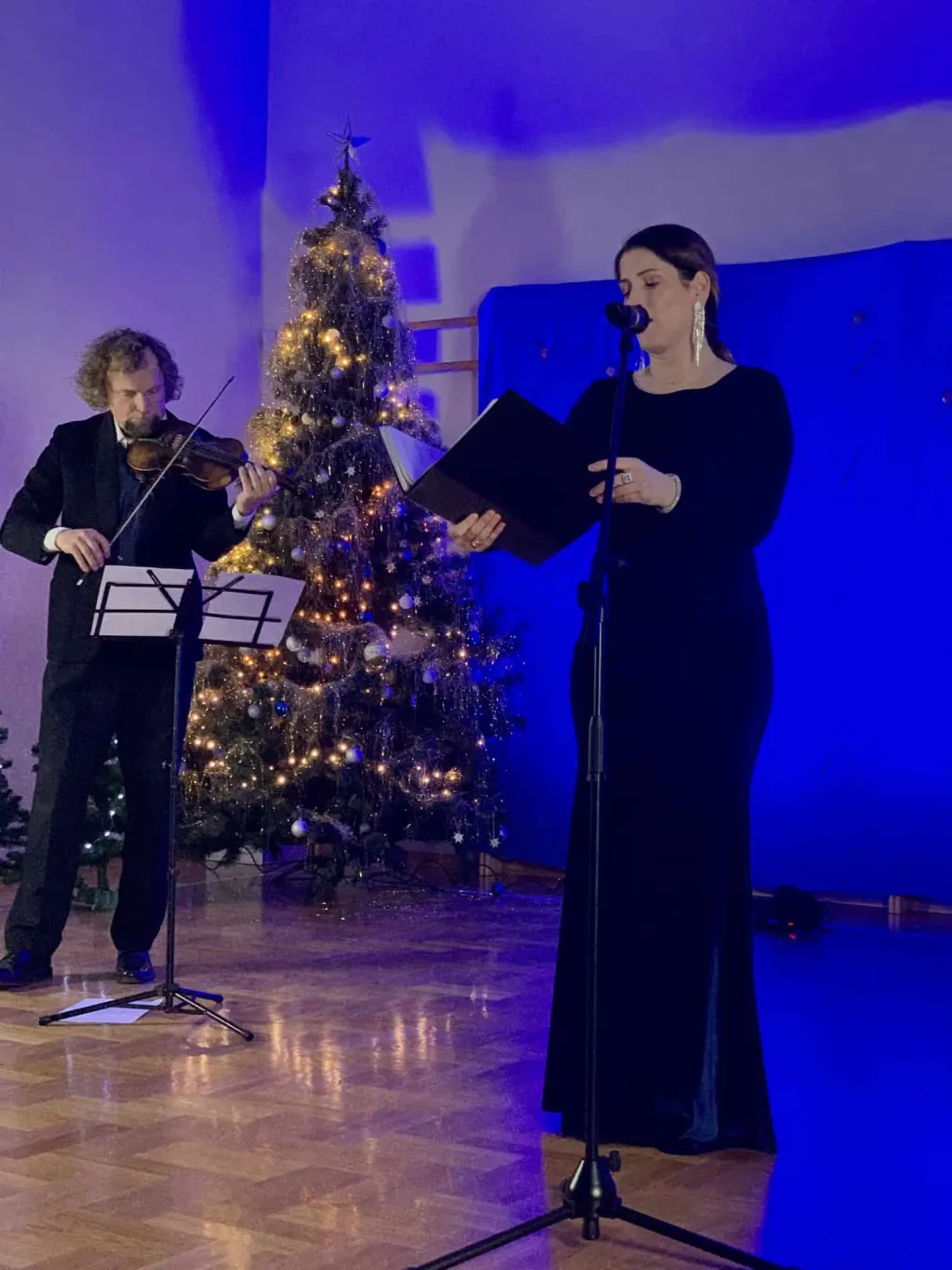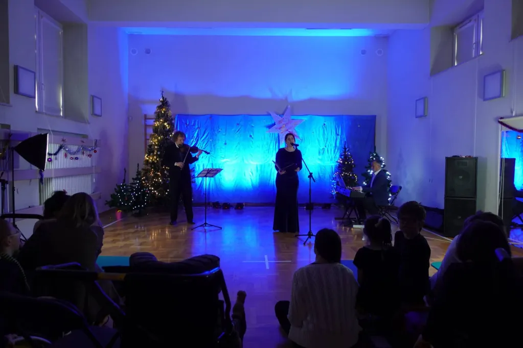 Sopranistka Opery Narodowej pani Lidia Kitlińska zaśpiewała dla przedszkolaków i uczniów klas młodszych znane polskie kolędy przy akompaniamencie skrzypcowym pana Jana Czyżewicza i fortepianowym pana Marcina Prokopiaka. Artyści i uczniowie byli tego dnia w strojach galowych, jak przystoi na koncert muzyki operowej, który odbył się tym razem wyjątkowo w sali gimnastycznej przy Białobrzeskiej 44. Do Teatru Narodowego wybierzemy się kiedy indziej bo scena operowa zawitała dzisiaj do naszej szkoły.