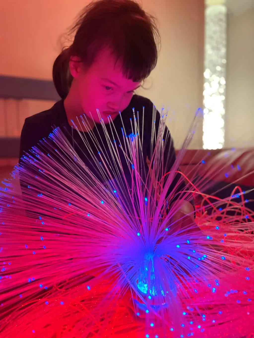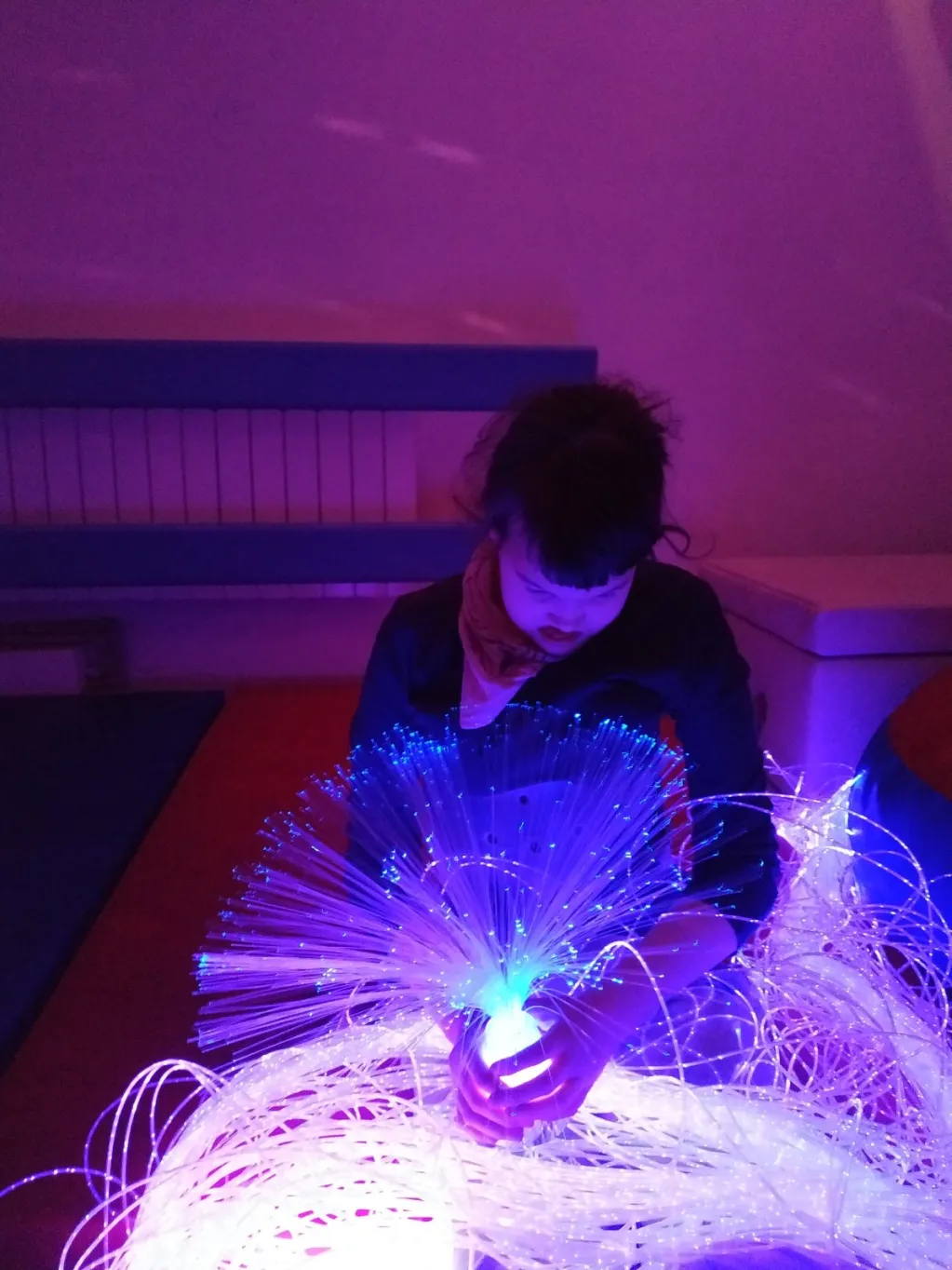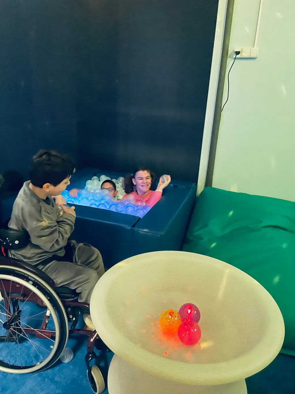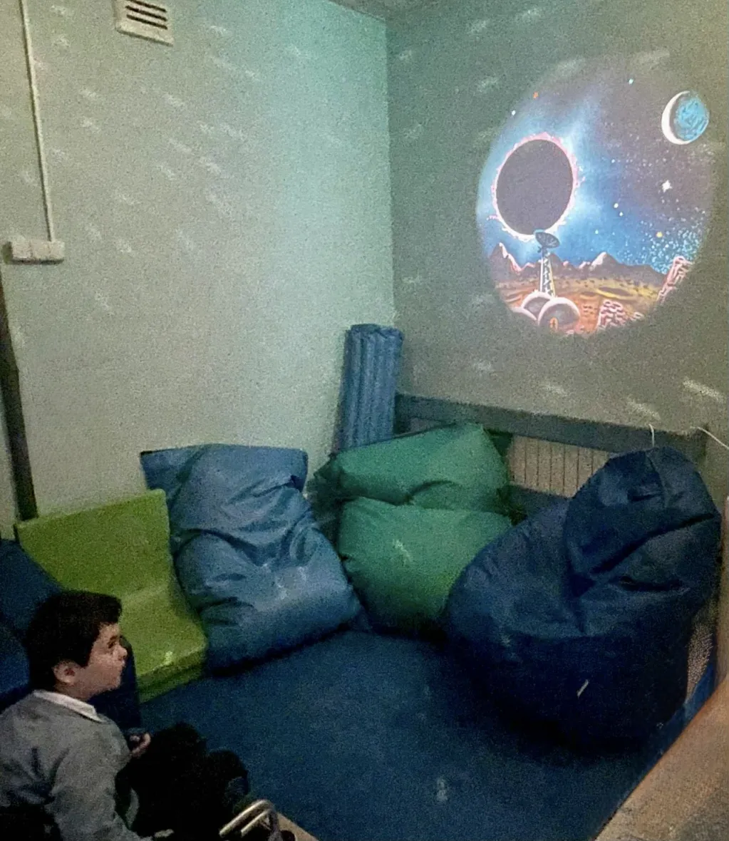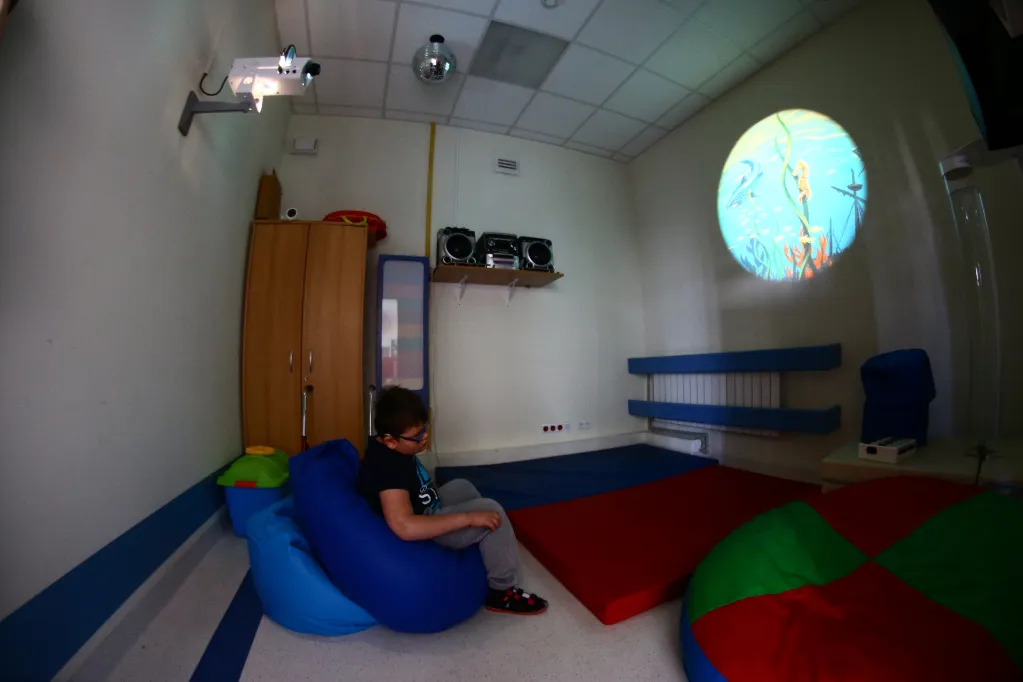 Nasza sala stymulacji percepcji wzrokowej i wyciszeń to wielofunkcyjna przestrzeń, która elastycznie odpowiada na różnorodne potrzeby dzieci i młodzieży. Dzięki odpowiednio dobranym światłom, kolorom i elementom wizualnym może aktywnie wspierać rozwój percepcji wzrokowej oraz koncentracji. Jednocześnie ta sama sala, po niewielkich modyfikacjach, staje się miejscem wyciszenia i regeneracji, pozwalającym na odpoczynek od nadmiaru bodźców. Stonowana kolorystyka, miękkie materiały i przyjazna akustyka sprzyjają relaksowi oraz regulacji emocji.
